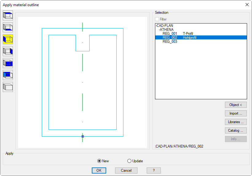 Inserts the selected free semi-finished product into the drawing when you terminate the dialog box with OK. You can use the view buttons to control whether the free semi-finished product is generated as a cross section, 2D projection or 3D bar. The input request depends on the type of insertion.