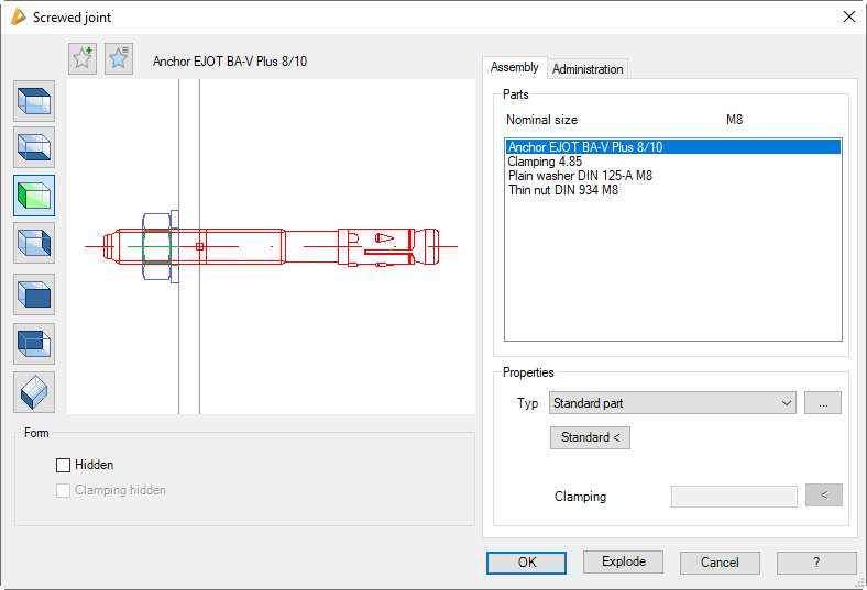 Changes the type of the selected constituent part. Three types can be used in the screwed joint. Standard part, Drilled hole and Clamping.