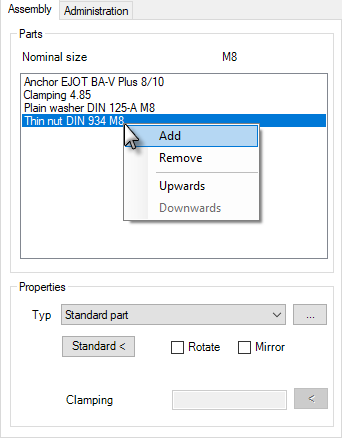 Shows the constituent parts of the current screwed joint. The nominal size of the screwed joint is shown above the list (e.g. M12). The first component in the list defines the nominal size of the complete screwed joint and should be a screw; this then leads to the other components. You can select a part of the screwed joint in the list to change its properties.
