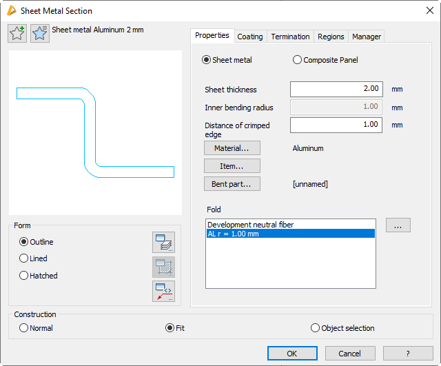 You can terminate the Dialog box Sheet metal section directly after calling the command by pressing the Enter key to access the input request. In this way you have the possibility of very quickly creating several sheets with identical properties.