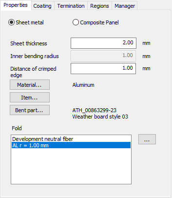 Shows the folding tables which have been assigned to the material. Here you can select a table with bending allowances, so that the correct development for the folded semi-finished product can be calculated. Optionally, here you can also choose development according to the neutral fiber and specify the bending radius in the appropriate input field.