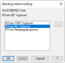 When you have selected a sheet metal section, the following input request appears and when you have selected a composite panel (e.g. Alucobond), the Dialog box Bending radius/milling is opened.