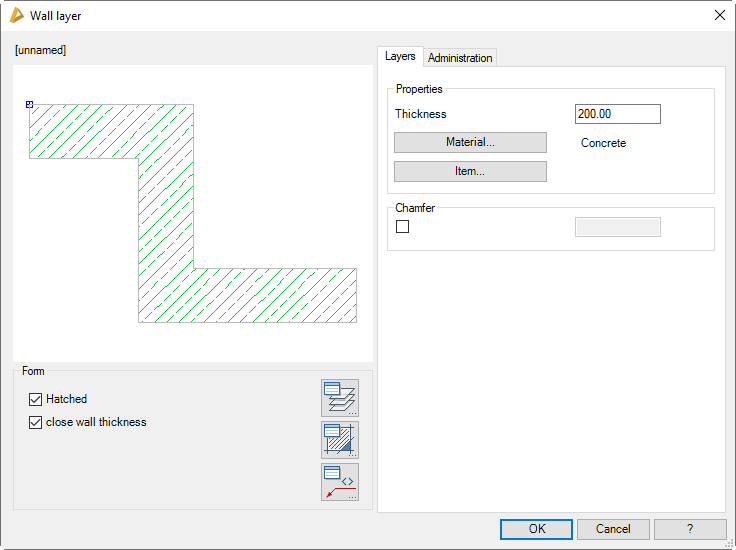 Activates chamfering for the wall layer. When you activate the tick box, you can specify the chamfer distance in the input field. Chamfers are always applied to each outer corner of the wall layer.