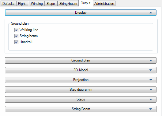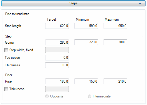 Here, apart from the calculated values of the current stairway the set default values as well as the minimum and maximum values are displayed for checking.