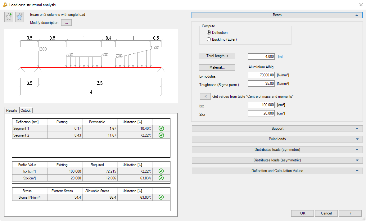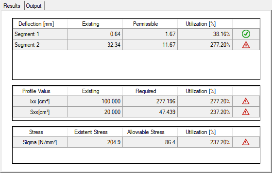 The results are calculated and displayed in real time. In each case the existing values are compared with permissible or required values and the percentage loading is given. Furthermore, a symbol indicates whether the permissible or required criteria are fulfilled or not.