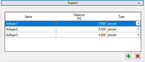 Here you define the supports for the beam or column. You can mark a row here to edit or delete it. Click on a field in the marked row to enable it to be edited.