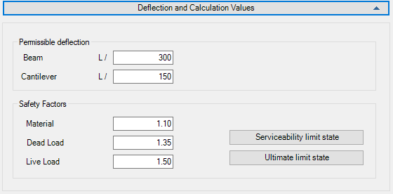 The permissible deflection and the safety factors for material, dead load and live load are only available if you are calculating the deflection.