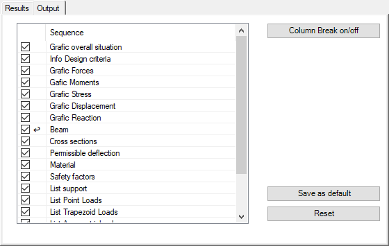 This lists the results which you can insert into the drawing once the structural analysis calculation has finished. The output is suppressed by deactivating the relevant tick box. You can change the order of the results output using drag and drop.