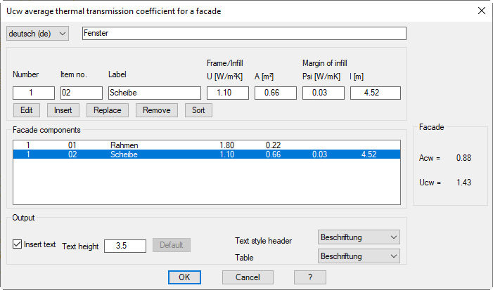 Here the entered elements or facade sections are displayed with their values. Mark a line with the mouse if you want to change it (Replace).