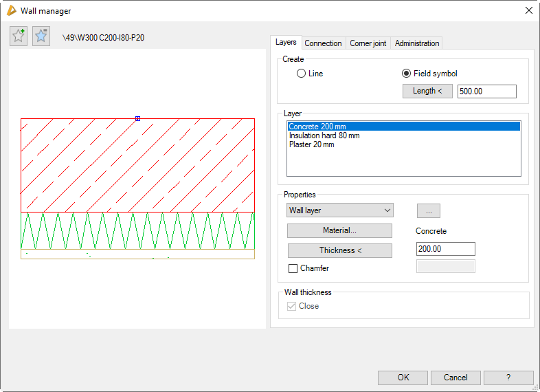 On the left side the dialog box contains a preview of the defined wall cross-section. On one hand it provides a visual check and on the other hand also a further function: Additional functions are activated by clicking in the preview with the mouse wheel. You will find further information on this in the section Object preview.