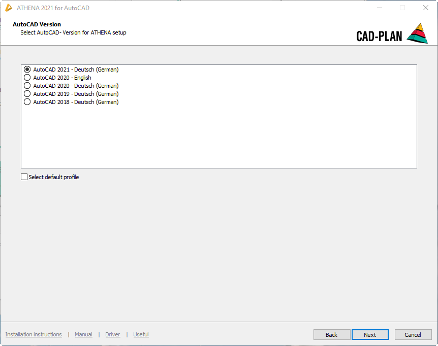 To install ATHENA 2021 for a number of AutoCAD versions, the setup routine must be repeated appropriately. For the following installations use the option Only configure (refer also to Section Create ATHENA profile).