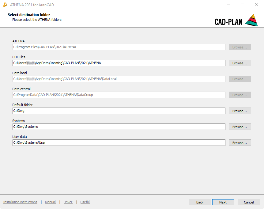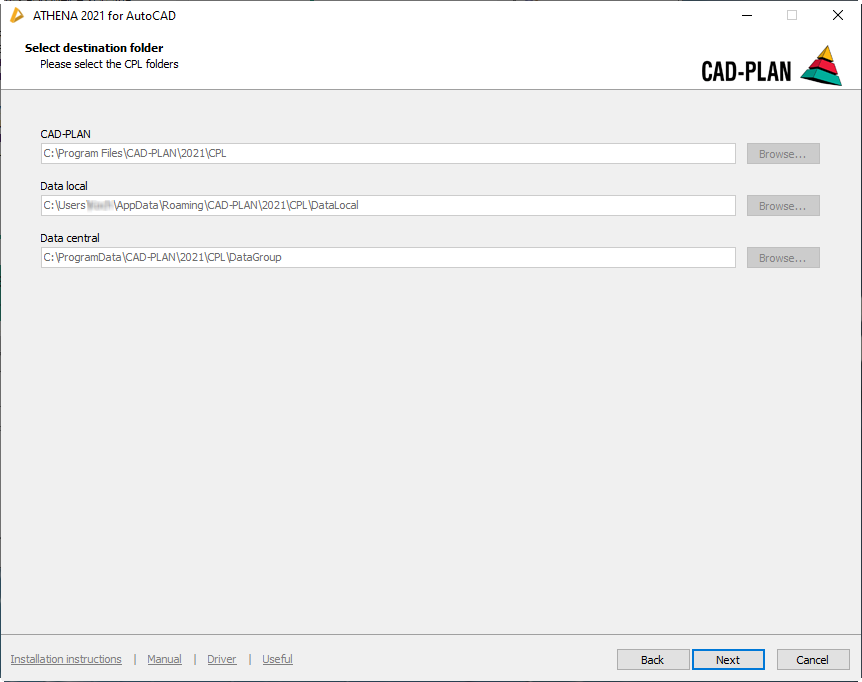 10. Specify here the destination folders for the CAD-PLAN program modules. Click the button Next > to proceed with the installation.