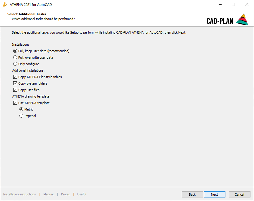 11. Select the type of installation. Both options of the full installation lead to the same result for a new installation. You can decide whether user files are to be updated or not only with a repair installation. The option Only configure is only available when ATHENA is installed on the computer. You will find further hints on this in the section Create ATHENA profile. Activate the tick box Copy ATHENA plot style tables if you want to use plot style tables which have been matched to the ATHENA layer. They are automatically copied from the setup into the AutoCAD plot styles folder. Activate the tick box Copy system folders to copy the folders and content of the profile system provider. Activate the tick box Copy user files to copy the folders and content of the user folder. Here, you select whether you want to use a template and, where applicable, change its units. Activate the tick box Make network files available offline if you have specified a network folder for the data paths and these should also be available without a network. Offline folders are realized via Windows Sync Center. It may be necessary to restart the operating system. Click the button Next > to proceed with the installation.