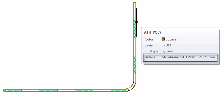 When you move the mouse over an ATHENA object, corresponding details are displayed in the quick info. Apart from the AutoCAD properties (color, layer, line style), these are also the specific properties of the relevant ATHENA object (e.g. membrane EPDM 1.2/200 mm).