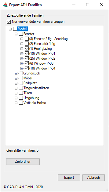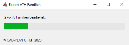 Dialogfeld Export ATH FamilienDas Programm hat im angegebenen Zielordner einen Unterordner mit dem Namen des Revit-Projektes erstellt und darin jede Familie als separate ATH-Zeichnung (Familienname.ath) abgelegt. Zu jeder Zeichnung wurde zusätzlich eine XML-Datei (Familienname.xml) gespeichert, welche die Typenparameter der Revit-Familie enthält. Informationen zur Struktur der XML-Daten finden Sie im Abschnitt XML-Parameter.