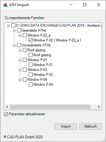 Sind die zu importierenden Familien Teil einer Familie mit mehreren Varianten, so wird der Import als separate, eigenständige Familie ohne Varianten durchgeführt und alle im Modell verwendeten Exemplare werden durch diese neue Familie ersetzt. Anschließend wird die Variante aus der Originalfamilie entfernt.
