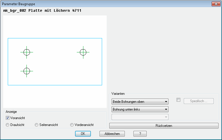 Wenn Sie Baugruppen mit Varianten in der Zeichnung verwenden möchten, wird das Dialogfeld Parameter Baugruppe angezeigt. Hier können Sie die Variante der Baugruppe einstellen, die Sie verwenden wollen.