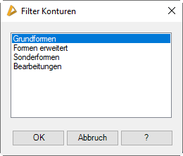 Die Liste zeigt Gruppierungen unter denen Grundformen zusammengefasst sind. Markieren Sie mit Hilfe von Strg oder Shift eine oder mehrere Gruppen. Alle markierten Gruppen werden in der Pulldownliste bereitgestellt.