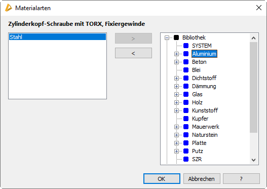 Die linke Liste zeigt die Materialien, die der Norm zugewiesen wurden. In der Grundeinstellung sind die meisten Normen (ausgenommen Profile) ohne Materialangabe (Materialart: System). Die rechte Liste zeigt die verfügbaren Materialien in einer Baumstruktur. In beiden Listen können Sie Materialien mit der Maus wählen.
