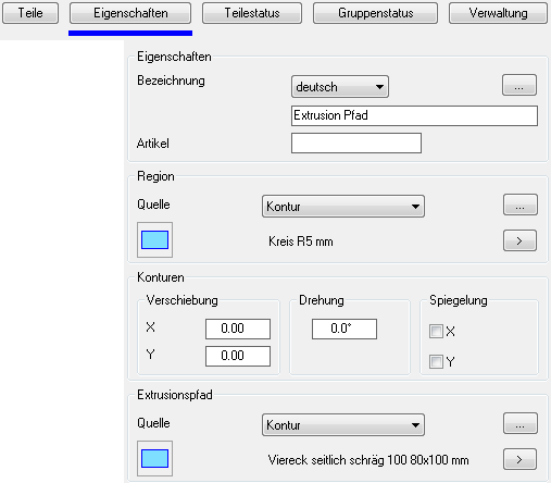 Registerkarte Eigenschaften bei Bauteiltyp Extrusion Pfad