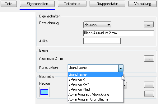 Registerkarte Eigenschaften bei Bauteiltyp Blech