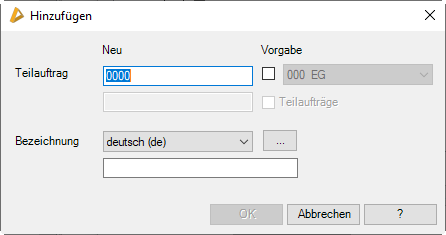 Der Name eines Auftrages/Teilauftrages innerhalb eines Projektes muss eindeutig sein. Wenn also der Auftragsname 001 heißt, ist kein Teilauftrag mit dem Namen 001 zulässig.