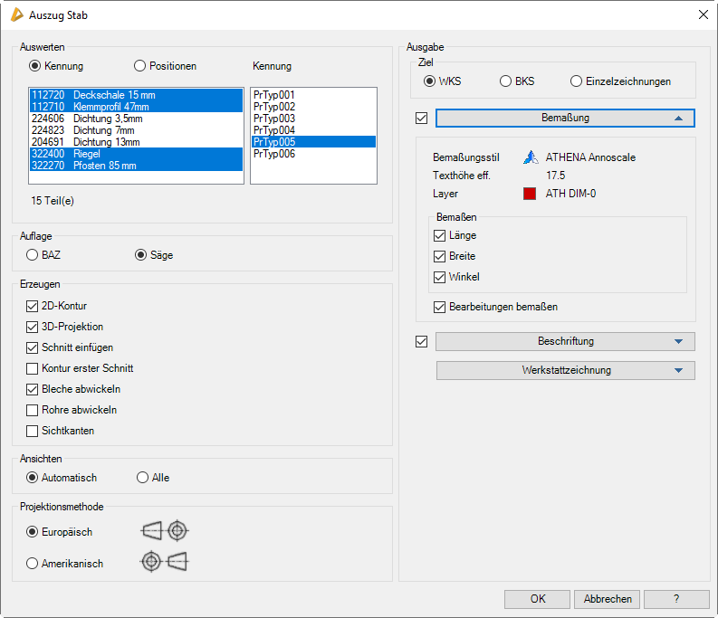 Wenn Sie das Dialogfeld mit OK beenden werden die Stabauszüge generiert. Wenn sie Werkstattzeichnungen erzeugen, werden diese automatisch gespeichert. Wenn Sie die Stabauszüge in das WKS oder BKS der Zeichnung einfügen folgt: