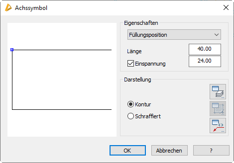 Die Füllungsposition definiert die Position und Ausrichtung einer Füllung. Das heißt, der Basispunkt des Symbols bildet den Einfügepunkt für eine Füllung. Durch die Ausrichtung des Symbols wird die Orientierung für eine Füllung festgelegt. Die Länge des Symbols ist frei einstellbar. Wählen Sie den Schalter Einspannung, um die Einspannstärke der Füllung anzugeben.