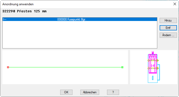Mit dieser Funktion können Sie einem Stab oder einer Stabprojektion Baugruppen über definierte Anordnungen zuweisen. Eine solche Anordnung kann direkt angelegt oder, wenn bereits vorhanden, zugewiesen werden. Näheres zum Thema Stabanordnung definieren finden Sie im Kapitel Anordnung bearbeiten.