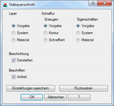 In diesem Dialogfeld können Sie die Darstellungseigenschaften von Stabquerschnitten ändern. Stabquerschnitte können Schnitteinfügungen von Stabbaugruppen aber auch Randverbunde von Füllungen (Gläser oder Paneele) sein.