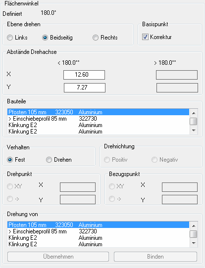 Der Bezugspunkt beschreibt den Punkt vom Drehpunkt der Baugruppe relativ zum Systempunkt des Bauteiles. Bei vielen Profilsystemen liegt der Systempunkt in Höhe der Glasauflage ohne Dichtung. Aus dem Bezugspunkt wird, in Abhängigkeit vom Flächenwinkel der Baugruppe, der Basispunkt der Baugruppe neu bestimmt, so dass die Baugruppe korrekt positioniert wird.