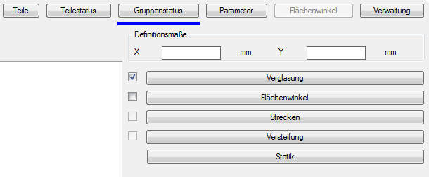 • Registerkarte Gruppenstatus: Hier definieren Sie Informationen und Eigenschaften der gesamten Stabbaugruppe. Sie können beispielsweise statische Werte hinterlegen oder einen variablen Flächenwinkel definieren.