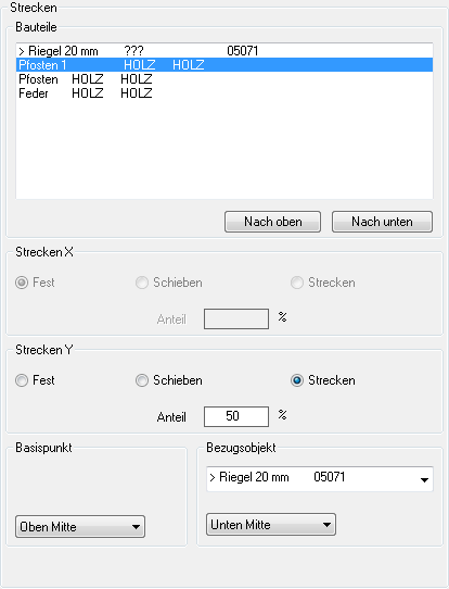 Wählt das Bauteil von welchem das selektierte Bauteil bei einer Maßänderung der Baugruppe direkt abhängig ist. Weiterhin wird hier mittels Pulldown-Menü der Punkt gewählt, von dem aus die unter Strecken X/Y festgelegte Aktion auf das untergeordnete Bauteil wirkt.