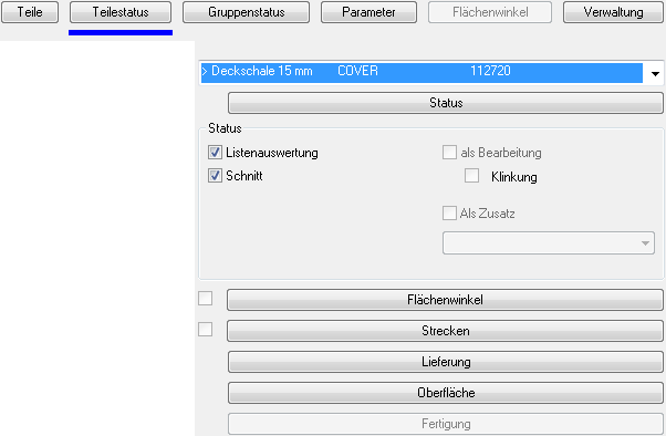 • Registerkarte Teilestatus: Hier können Sie den zusätzliche Informationen Eigenschaften der Bauteile beeinflussen. Sie können beispielsweise festlegen ob das Bauteil in der Stückliste aufgeführt werden soll oder nicht.