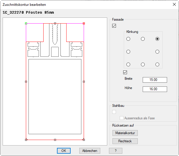Aktiviert den Fassadenmodus, wo Sie rechteckige Klinkungen durch Parameter definieren können. Die aktuelle Zuschnittskontur wird magentafarben angezeigt. Sobald Sie eine Klinkung definieren, wird die Zuschnittskontur neu berechnet und rot dargestellt.