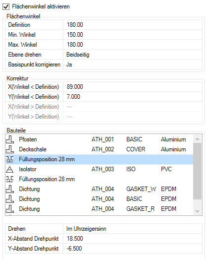 In der Bauteilliste können Sie die Bauteile wählen, die abhängig vom Winkel gedreht werden sollen.
