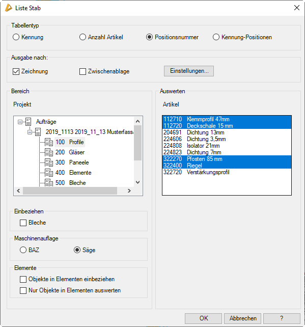 Im Dialogfeld Liste Stab können Sie festlegen was in die Stückliste geschrieben werden soll.
