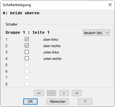 Wechselt zwischen den verschiedenen Gruppen und Seiten. Links wird angezeigt in welcher Gruppe und auf welcher Seite der jeweiligen Gruppe Sie sich befinden. Jede Gruppe enthält drei Seiten mit jeweils acht Schaltern.