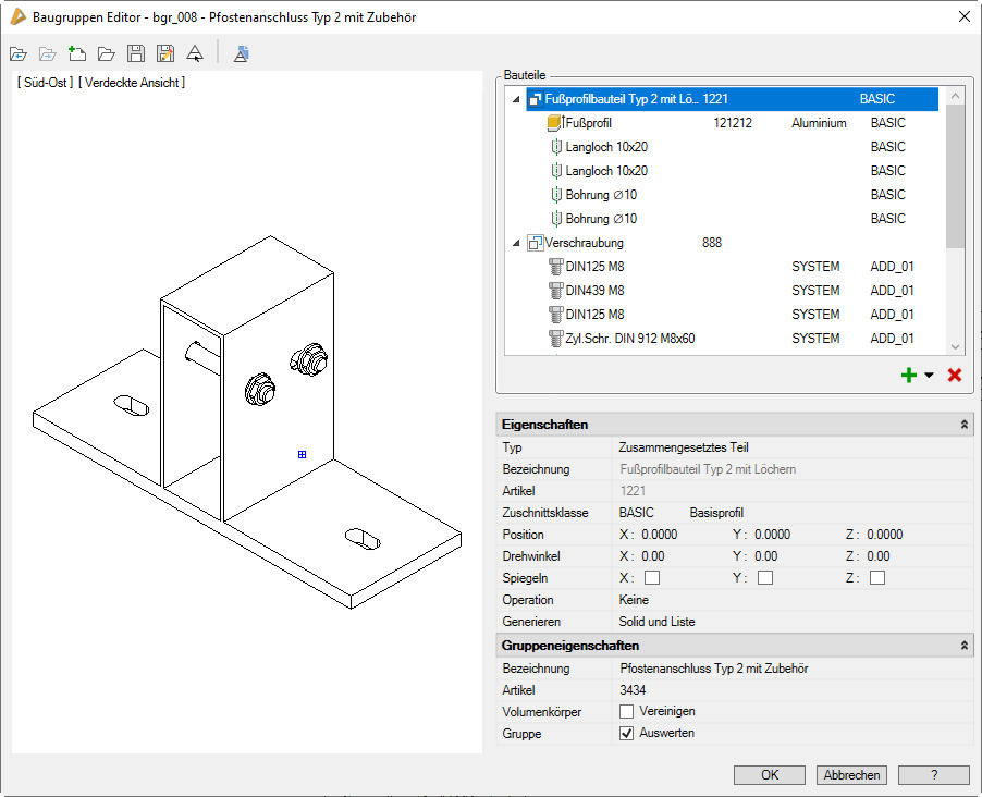 Diese Funktion dient dem Anlegen und Editieren von gebräuchlichen Baugruppen. Diese können als räumliches 3D-Teil oder als 2D-Projektion direkt in der Zeichnung verwendet werden. Mit Anordnung anwenden kann eine Baugruppe durch Regeln mit einemStab verbunden werden. Gebräuchliche Baugruppen sind beispielsweise: