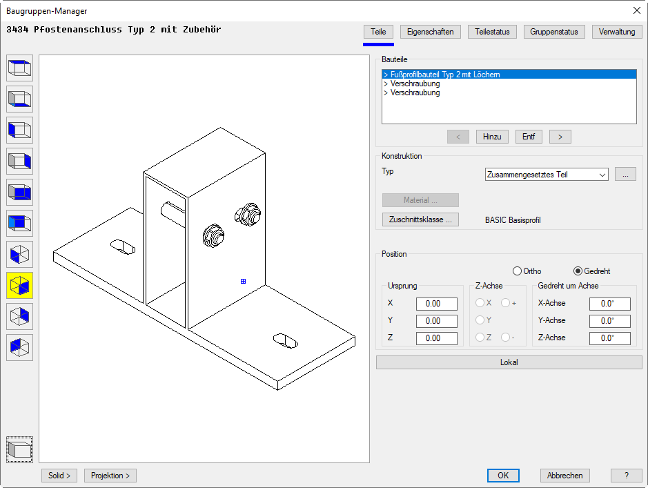 Mit den Schaltflächen auf der linken Seite können Sie zwischen verschiedenen fest definierten Ansichten auf die Baugruppe umschalten. Neben der Drahtkörperdarstellung ist auch eine verdeckte Darstellung möglich.