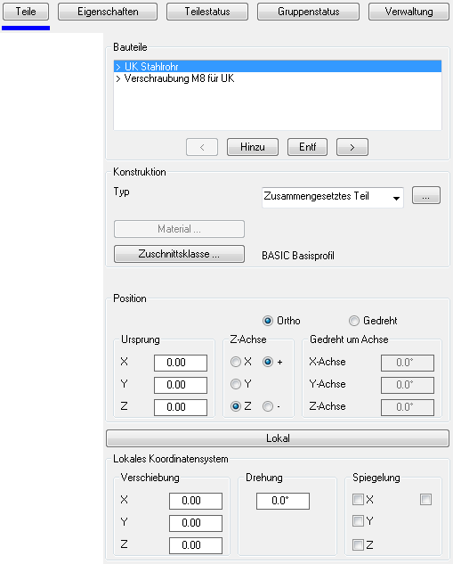 In diesem Bereich wird die Position und Orientierung des Bauteiles in seinem Koordinatensystem beschrieben. Alle Angaben werden relativ zum Bauteil-Koordinatensystem beschrieben. Zur Verfügung stehen Koordinatenangaben, Drehwinkel und Spiegelung.