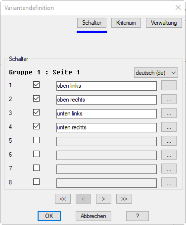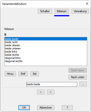 Definiert die Schalterstellung für das jeweilige Kriterium. Hierfür wird das Dialogfeld Schalterbelegung gestartet, wo Sie die entsprechenden Schalter für das Kriterium an- oder abhaken können.