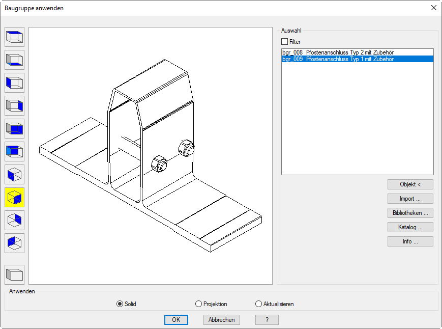 Mit den Schaltflächen auf der linken Seite können Sie zwischen verschiedenen fest definierten Ansichten auf die Baugruppe umschalten. Neben der Drahtkörperdarstellung ist auch eine verdeckte Darstellung möglich.