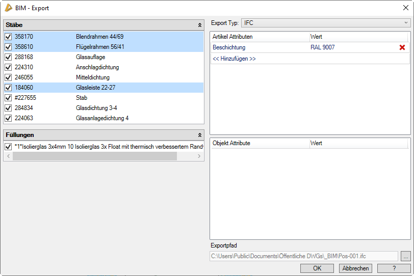 Auf der linken Seite des Dialogfeldes sehen Sie die im Auftrag enthaltenen Elemente (Stäbe, Füllungen, usw.)