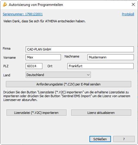 Drücken Sie diesen Button um eine Lizenzdatei (*.v2c), die Sie von CAD-PLAN erhalten haben, zu importieren. Durch den Import werden die erforderlichen Daten für die Freischaltung von ATHENA 2021 auf Ihren Hardwareschutzstecker geschrieben.