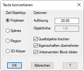 Mit der Auflösung bestimmen Sie die Genauigkeit bei der Textkonvertierung in Polylinien. Je höher die Auflösung, desto länger dauert die Konvertierung der Texte. Wir empfehlen einen Wert zwischen 5 und 20. Objekthöhe ist nur beim Ziel-Objekttyp 3D-Körper verfügbar und definiert die Höhe des Objekts. Wenn Quellobjekte löschen aktiviert ist, werden die gewählten Texte gelöscht. Wenn Eigenschaften übernehmen aktiviert ist, werden die Layereigenschaften des Textes übernommen. Ansonsten verwendet ATHENA den aktuellen Layer. Wenn Unbenannten Block bilden aktiviert ist, werden die konvertierten Texte als anonyme Blöcke gespeichert.