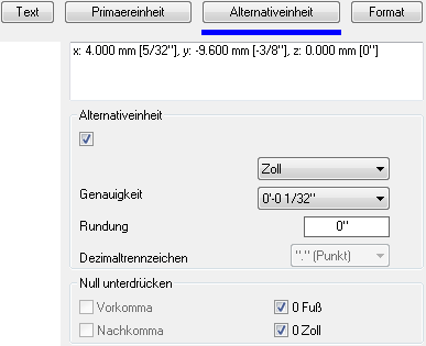 Wenn Sie dezimale Einheiten eingestellt haben, werden zöllige Einheiten als Alternativeinheit verwendet. Wenn Sie zöllige Einheiten eingestellt haben, werden dezimale Alternativeinheiten verwendet.