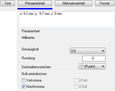 Bestimmt die Rundungsregeln für die Primäreinheiten. Wenn Sie hier den Wert 0.25 eingeben, werden alle Abstände auf die nächste Viertelstufe gerundet. Wenn Sie den Wert 1.0 eingeben, werden alle Abstände auf die nächste Ganzzahl gerundet. Die Anzahl der Ziffern hinter dem Dezimaltrennzeichen hängt von der Einstellung Genauigkeit ab.
