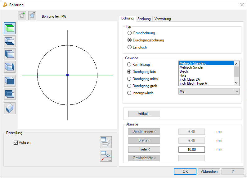 Im Dialogfeld finden Sie auf der linken Seite den Darstellungsbereich mit der dynamischen Vorschau. Auf der rechten Seite sehen Sie den Bedienbereich mit den Registerkarten Bohrung, Senkung und Verwaltung.