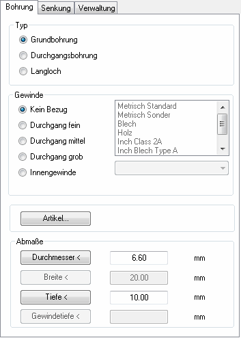 Öffnet das Dialogfeld Artikel, wo Sie eine Artikelnummer (bzw. Bearbeitungsnummer) für die Bohrung angeben können. Eine ausführliche Erklärung zu Artikeln finden Sie im Kapitel Artikel.